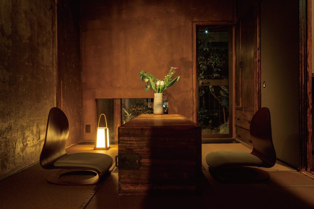 間接照明がゆらめく茶室空間へ身をおけば、