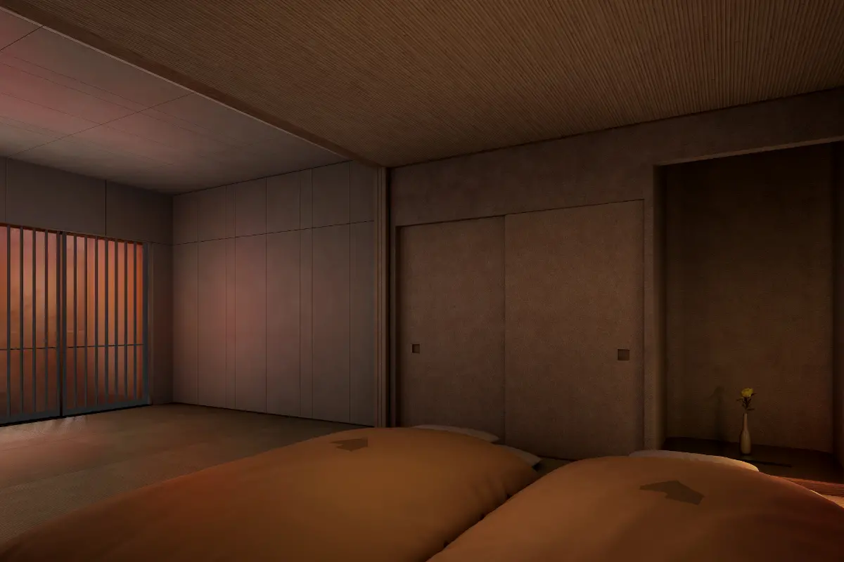 The spacious room you will find on the other side of the sliding door is rendered as a single work of art, with its walls and ceiling draped in beautiful Japanese paper that reflects the expressions of the gentle, shifting lights.